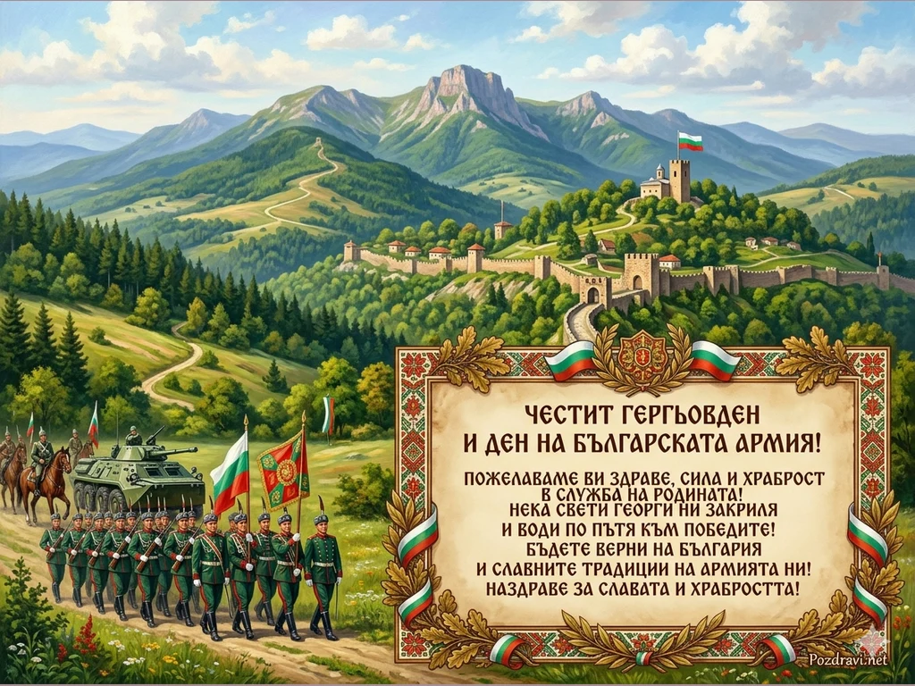 Тази красива поздравителна картичка за Гергьовден и Деня на Българската армия преплита национална гордост и природна красота. В основата на картичката е разположена голяма, орнаментирана рамка с фон от пергамент, в която е изписано вълнуващо пожелание: 'ЧЕСТИТ ГЕРГЬОВДЕН И ДЕН НА БЪЛГАРСКАТА АРМИЯ! ПОЖЕЛАВАМЕ ВИ ЗДРАВЕ, СИЛА И ХРАБРОСТ В СЛУЖБА НА РОДИНАТА! НЕКА СВЕТИ ГЕОРГИ НИ ЗАКРИЛЯ И ВОДИ ПО ПЪТЯ КЪМ ПОБЕДИТЕ! БЪДЕТЕ ВЕРНИ НА БЪЛГАРИЯ И СЛАВНИТЕ ТРАДИЦИИ НА АРМИЯТА НИ! НАЗДРАВЕ ЗА СЛАВАТА И ХРАБРОСТТА!'. Фонът на картичката показва величествен планински пейзаж, вероятно Стара планина, с укрепена средновековна крепост, вдъхновена от Царевец, от чиято кула се вее българският трикольор. Пред нея минава военен парад – войници в исторически униформи, конница и модерна бронирана техника, водени от офицери, носещи националните знамена. Картичката носи дух на чест, храброст и почит към традициите и героите на България.