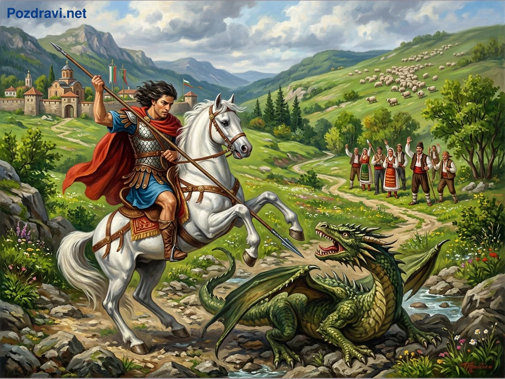 На картината е изобразен конник на бял кон, облечен в рицарски доспехи и червена мантия, който пронизва зелен дракон с копие. Действието се развива в живописна планинска долина, където в далечината се вижда манастир с български знамена. Група селяни в народни носии наблюдават с възторг сцената, а на близкия хълм пасе стадо овце. Цялата композиция е изпълнена с динамика и патриотичен дух, пресъздавайки легендата за Свети Георги Победоносец.