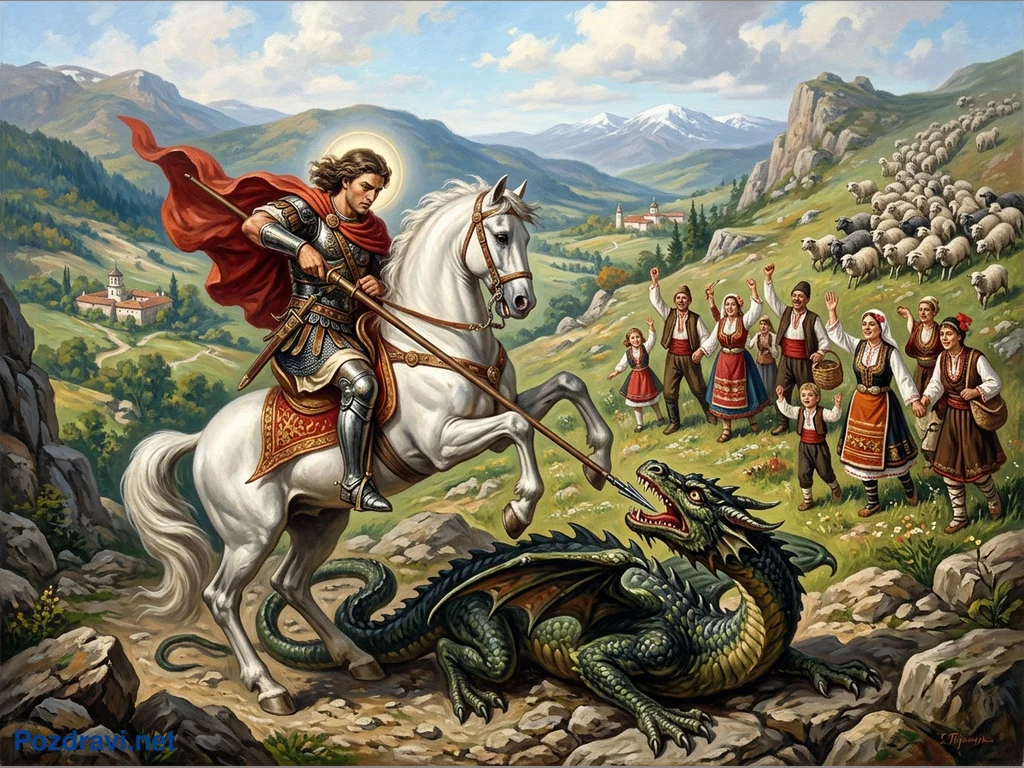 Ключови фрази: Свети Георги дракон, Български фолклор, Религиозна картина, Планински пейзаж, Традиционни носии