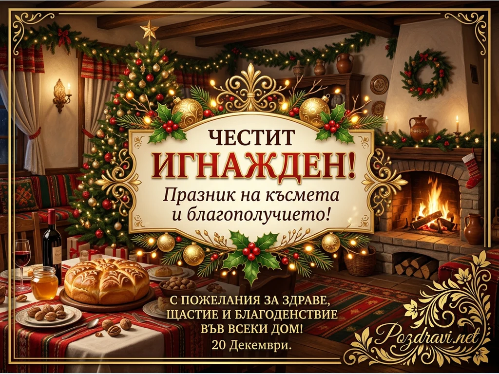 Ключови фрази: Честит Игнажден, поздравителна картичка, зимни празници, традиционна пита, коледна украса