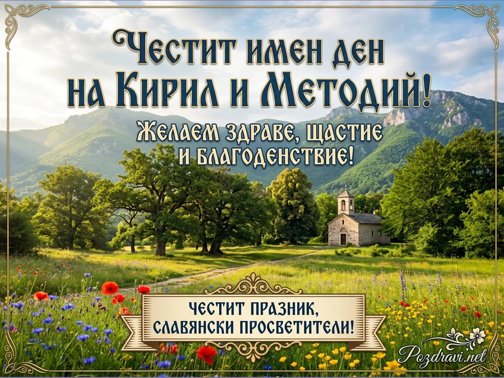 Поздравителна картичка с живописен пейзаж, изобразяващ зелени планини на заден план и слънчева поляна с множество цветя – червени макове, сини метличини и жълти полски цветя – на преден план. В центъра на композицията е разположена малка каменна църква с камбанария, заобиколена от високи дървета, към която води полска пътека. Над пейзажа е изписано 'Честит имен ден на Кирил и Методий! Желаем здраве, щастие и благоденствие!', а в долната част – 'Честит празник, славянски просветители!'. Картичката предава празнично и тържествено настроение, съчетавайки природна красота с духовно послание.