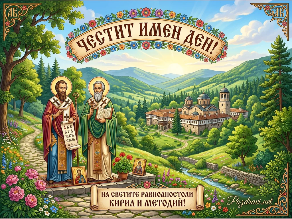 Ключови фрази: Честит имен ден, Кирил и Методий, Православна картичка, Български манастир, Празник