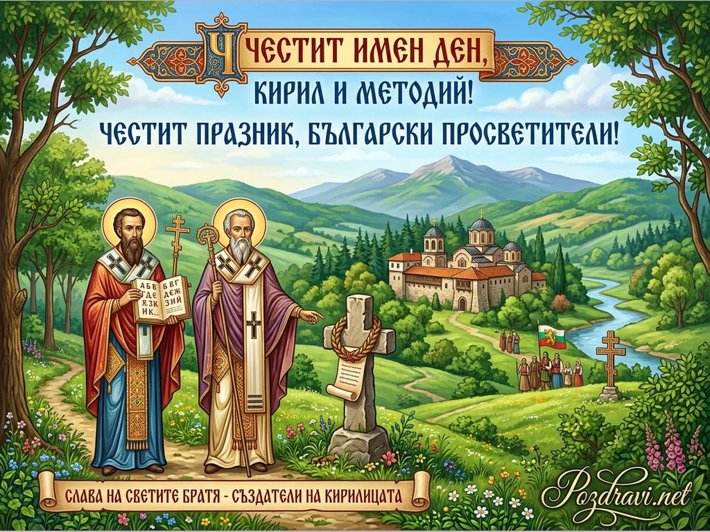 Тази цветна илюстрация изобразява Светите братя Кирил и Методий в преден план, облечени в одежди, на фона на живописен планински пейзаж. В далечината се вижда красив манастирски комплекс с куполи и червени покриви, разположен сред зелени хълмове и гора, покрай която тече река. Група хора в народни носии с българско знаме вървят по пътека, а в горната част на картичката е изписано 'ЧЕСТИТ ИМЕН ДЕН, КИРИЛ И МЕТОДИЙ! ЧЕСТИТ ПРАЗНИК, БЪЛГАРСКИ ПРОСВЕТИТЕЛИ!'. Долният надпис гласи 'СЛАВА НА СВЕТИТЕ БРАТЯ - СЪЗДАТЕЛИ НА КИРИЛИЦАТА', подчертавайки тяхната роля за създаването на кирилицата.