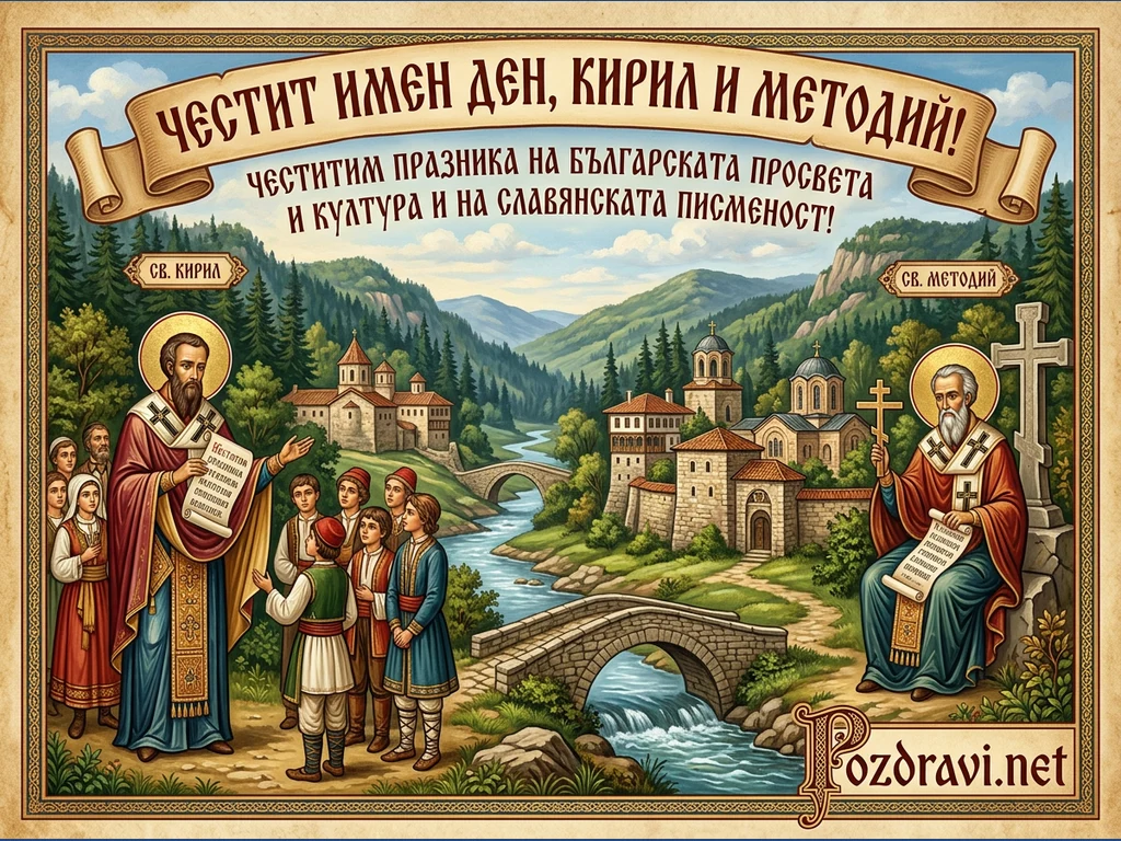 Тази илюстрация изобразява Светите братя Кирил и Методий в живописен планински пейзаж, осеян с манастири и река с каменни мостове. Отляво, Свети Кирил е показан да преподава на група деца, държейки свитък с кирилски букви. Отдясно, Свети Методий е седнал до голям каменен кръст, също свитък и кръст в ръка. Над тях се вие лента с надпис 'ЧЕСТИТ ИМЕН ДЕН, КИРИЛ И МЕТОДИЙ! ЧЕСТИТИМ ПРАЗНИКА НА БЪЛГАРСКАТА ПРОСВЕТА И КУЛТУРА И НА СЛАВЯНСКАТА ПИСМЕНОСТ!'. Цялостната композиция е в стил, напомнящ традиционна православна иконография и възрожденско изкуство.