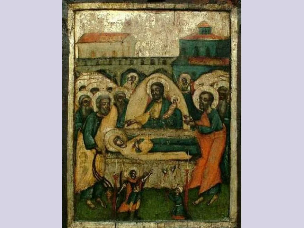 много стара икона на която е изобразено успението на Дева Мария Според народната традиция, празникът се нарича Голяма Богородица, за разлика от Малката Богородица (8 септември), когато се чества рождението на Христовата майка.
