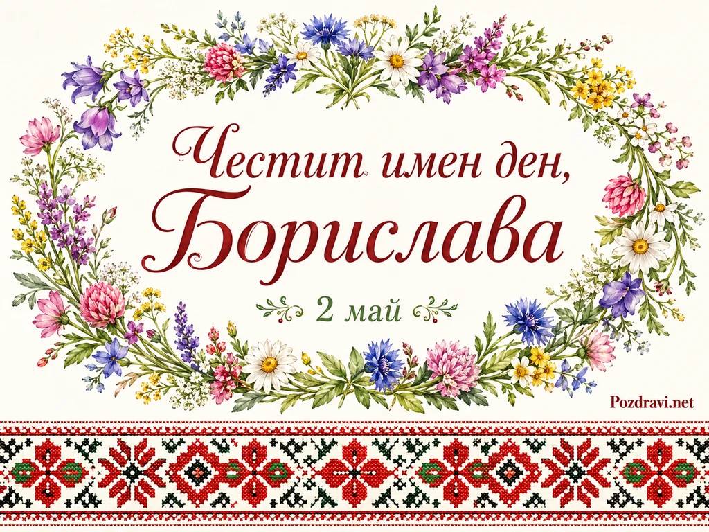Ключови фрази: честит имен ден Борислава 2 май, акварелен венец от полски цветя, българска шевица червено черно зелено, пролетна флорална рамка с маргаритки