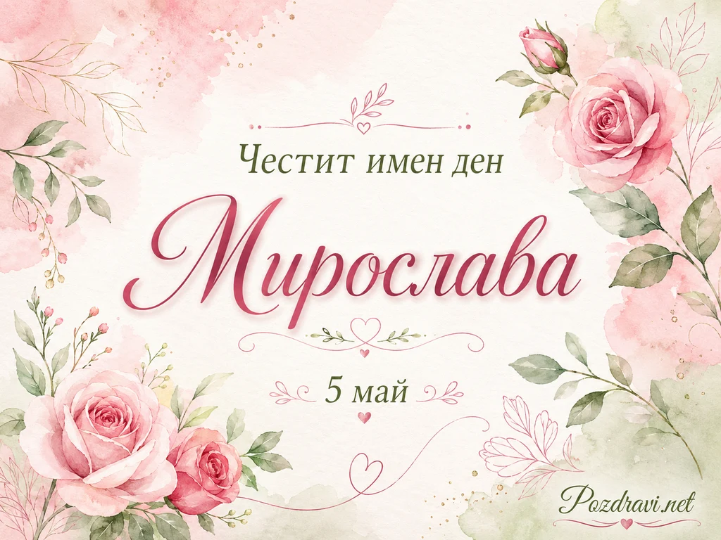 Нежна акварелна картичка е оформена с меки розови и зелени тонове върху светъл текстуриран фон. В центъра са изписани дословно 'Честит имен ден', 'Мирослава' и '5 май'. Името 'Мирослава' е най-големият акцент и е написано с елегантен розов калиграфски шрифт. Около текста има фини декоративни линии, малки сърца и растителни орнаменти. В горния десен и долния ляв край се виждат големи розови рози с нежни зелени листа. Композицията създава романтично, празнично и много деликатно усещане за имен ден през пролетта.