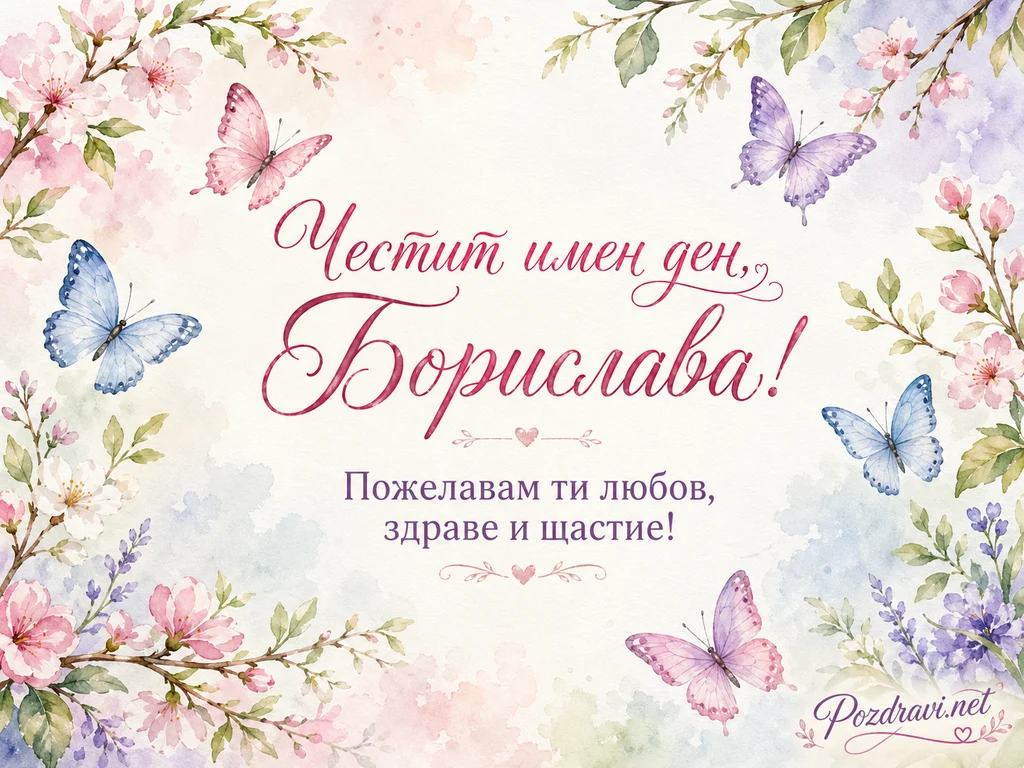 Нежна акварелна композиция в пастелни тонове оформя светъл фон с меко преливане на розово, лилаво, синьо и зелено. По краищата има богата рамка от цъфнали клонки, листа и дребни цветове, които придават пролетно настроение. Наоколо са разположени няколко пеперуди в розово, лилаво и синьо, като крилата им са фино преливащи и детайлно очертани. В центъра стои изящен надпис с калиграфски шрифт: 'Честит имен ден, Борислава!'. Под него има втори ред текст в лилаво: 'Пожелавам ти любов, здраве и щастие!'. Между двата текста са добавени малки декоративни орнаменти и сърчица, които подсилват празничния и романтичен стил.