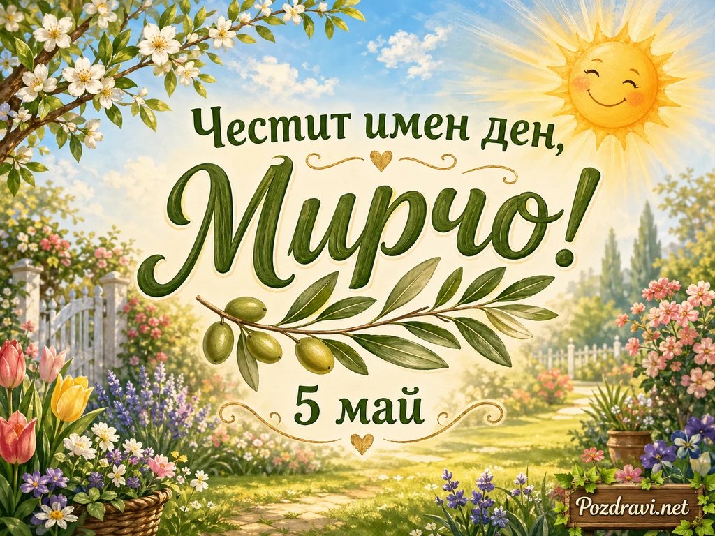 Слънчева пролетна градина е изпълнена с цъфнали клони, лалета, маргаритки, розови храсти и свежа зеленина. В центъра стои голям декоративен надпис с името 'Мирчо', изписано с елегантни зелени букви. Над него дословно пише 'Честит имен ден,', а под маслиновата клонка е добавена датата '5 май'. Усмихнато слънце огрява сцената от горния десен ъгъл и създава топло, радостно настроение. Маслиновата клонка с плодове подчертава връзката с името и придава спокоен, природен акцент. Белият градински портал, цветните лехи и меката светлина оформят празнична и нежна атмосфера. Картичката носи усещане за благословия, пролетна свежест и лично внимание към именника.