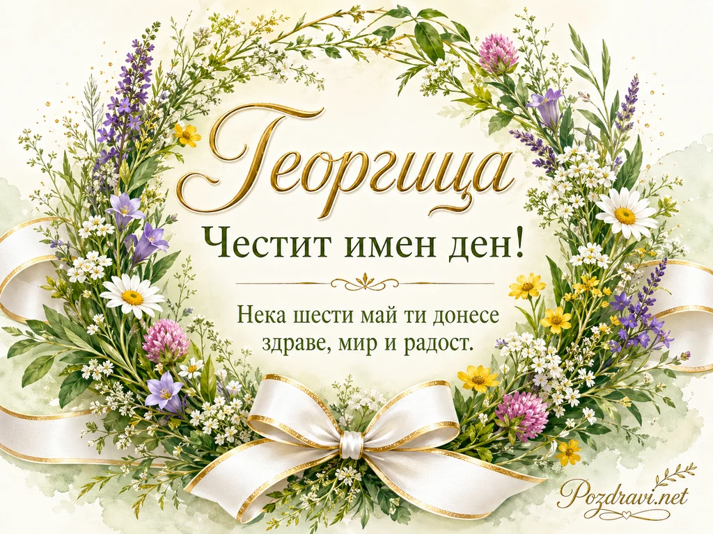 Нежна празнична картичка е оформена с богат цветен венец от зелени клонки, маргаритки, лилави цветя, жълти цветчета и розови детелини. В центъра стои надписът 'Георгица Честит имен ден! Нека шести май ти донесе здраве, мир и радост.'. Името е изписано с елегантни златисти букви, а останалият текст е в тъмнозелен цвят. Декоративна златна линия с малък орнамент разделя поздрава от долното послание. В долната част има голяма бяла панделка със златист кант, която придава тържествен и изискан вид. Фонът е светъл, мек и акварелен, което подчертава пролетното настроение. Цялата композиция носи усещане за свежест, благословия и радост за имен ден.
