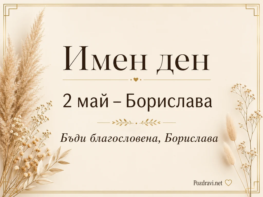 Нежен фон в топли бежови тонове създава усещане за спокойствие и елегантност. Тънка златиста рамка с декоративни ъгли обрамчва композицията и придава празничен вид. Отляво се разперват пухкави стръкове пампаска трева и сухи клонки, а в долната лява част има деликатни листа и дребни цветчета в кремаво. Отдясно се виждат фини сухи стъбла с малки светли пъпки и меки, овални класчета. В центъра с големи изящни букви е изписано 'Имен ден', а под него стои '2 май – Борислава'. По-ниско, в курсивен стил, е добавено посланието 'Бъди благословена, Борислава'.