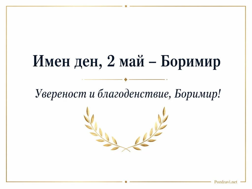 Ключови фрази: имен ден Боримир 2 май, увереност и благоденствие Боримир текст, златен лавров венец минимализъм, тъмносин серифен шрифт елегантен дизайн