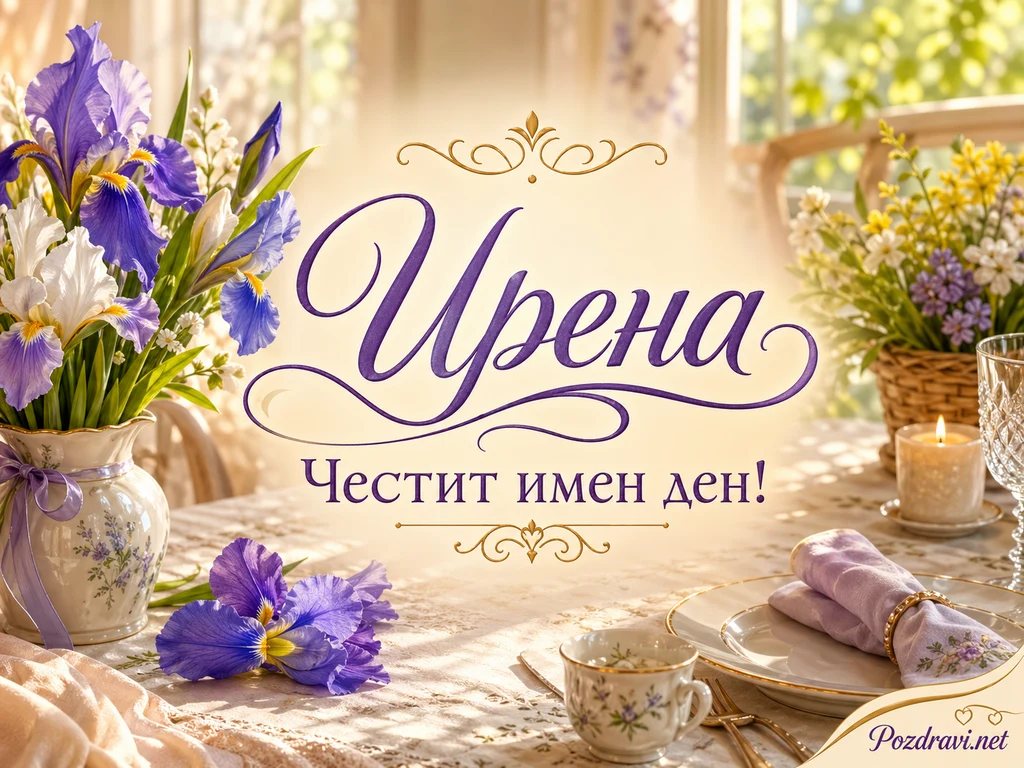 Нежна именна картичка е украсена с голям лилав калиграфски надпис 'Ирена' и текста 'Честит имен ден!'. Вляво има изящен букет от лилави ириси в порцеланова ваза с флорални мотиви и сатенена панделка. На масата лежат още няколко ириса, които допълват празничната композиция. Фонът е топъл и светъл, с меко слънце, прозорец и пролетна зеленина навън. Вдясно се виждат подредени чинии, лилава салфетка, чаена чаша, свещ и кошница с дребни цветя. Златистите орнаменти около текста придават елегантен и тържествен вид на картичката.