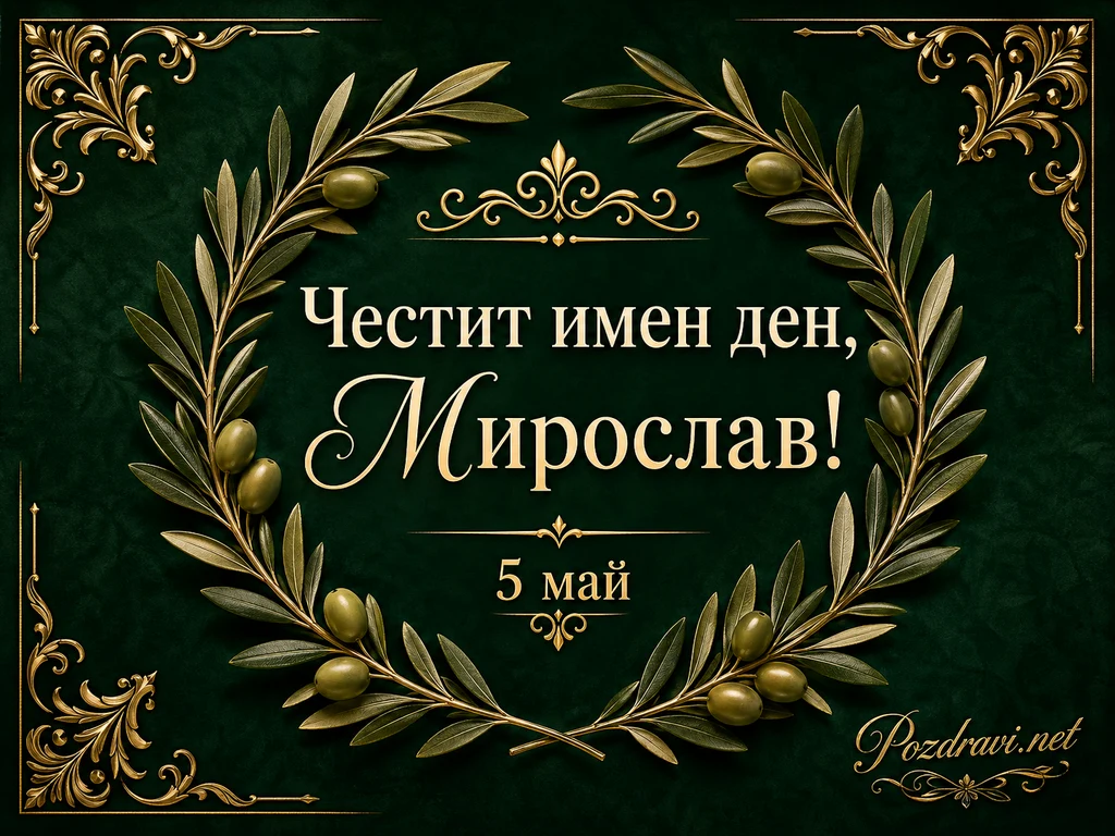 Ключови фрази: имен ден Мирослав 5 май, Честит имен ден Мирослав, маслинов венец за имен ден, златни орнаменти имен ден