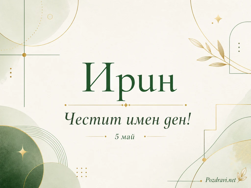В центъра стои голям надпис 'Ирин', изписан с елегантни зелени букви. Под него е поставен текстът 'Честит имен ден!', а още по-надолу е отбелязано '5 май'. Фонът е светъл, мек и леко текстуриран, което придава изчистено и тържествено усещане. Декорацията съчетава зелени и златисти линии, кръгове, точки и фини геометрични рамки. Вдясно има нежни златисти листа, които добавят природен и празничен акцент. Композицията изглежда стилна, спокойна и подходяща за имен ден с персонално посвещение.