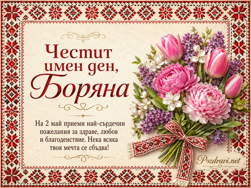 Винтидж картичка с кремав, леко състарен фон е оградена от богата рамка с българска шевица в червено, черно и бяло. Вляво стои голям надпис 'Честит имен ден, Боряна' с декоративни орнаменти и малко сърце под името. Под него е изписан текстът 'На 2 май приеми най-сърдечни пожелания за здраве, любов и благоденствие. Нека всяка твоя мечта се сбъдва!'. Вдясно има пищен пролетен букет с розови лалета, розови божури, лилав люляк и бели цветчета със зелени листа. Букетът е вързан с широка панделка с народни мотиви в червено и бяло. Композицията съчетава традиционни български орнаменти и нежна флорална украса в празничен стил.