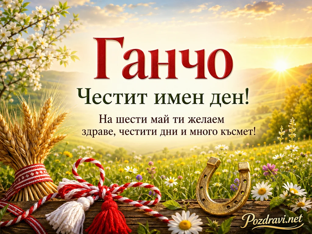 На картичката е изписано дословно: 'Ганчо Честит имен ден! На шести май ти желаем здраве, честити дни и много късмет!'