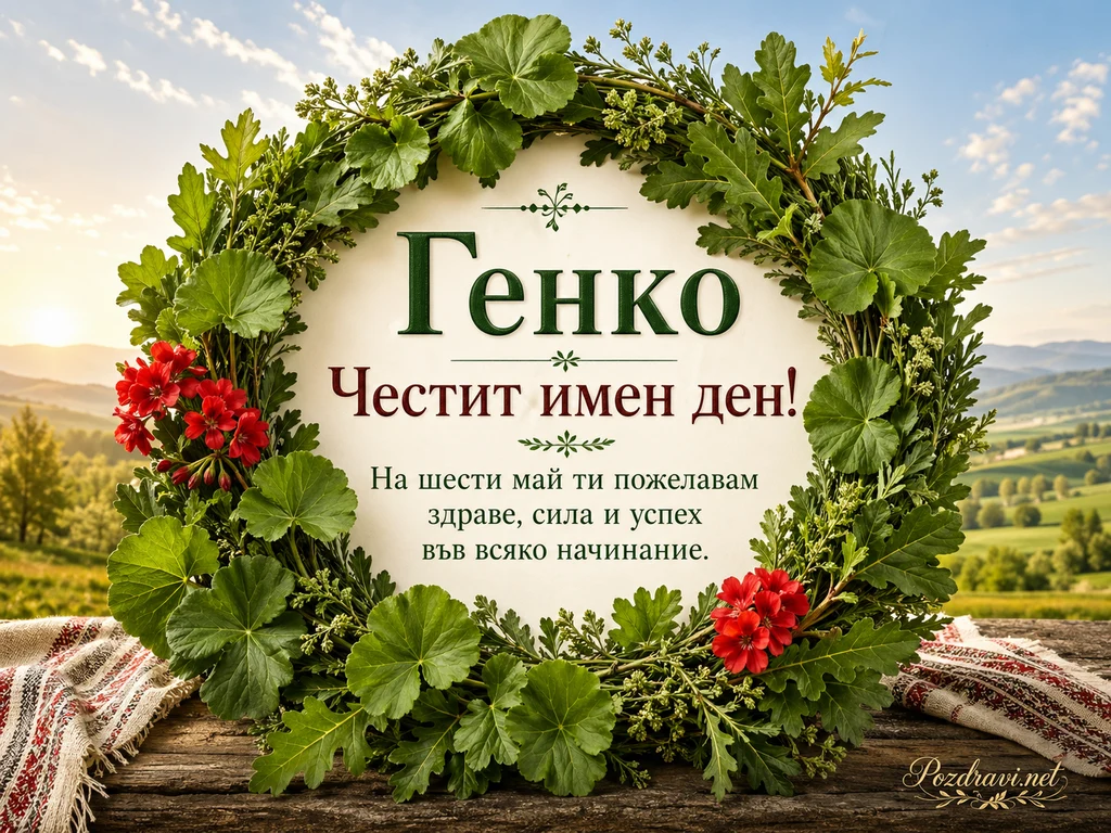 В центъра стои празнична картичка с голям зелен венец от свежи листа, треви и малки цветни пъпки. Вляво и вдясно венецът е украсен с яркочервени цветове, които контрастират с наситената зеленина. На светлия фон в средата е изписано дословно: 'Генко Честит имен ден! На шести май ти пожелавам здраве, сила и успех във всяко начинание.' Картичката е поставена върху дървена повърхност с традиционни тъкани платове от двете страни. Зад нея се вижда слънчев селски пейзаж с хълмове, поляни и меко небе с леки облаци. Общото настроение е пролетно, тържествено и свързано с българска именденска традиция. Зелените листа и природният фон подсилват усещането за Гергьовден и благословия за здраве и успех.