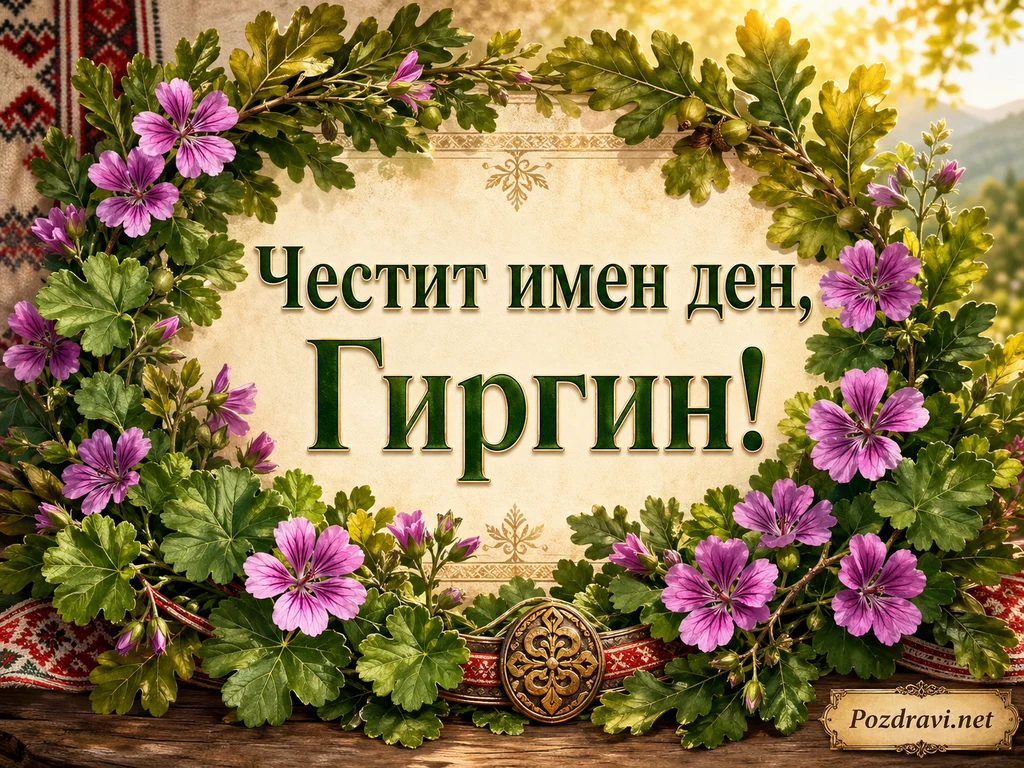Ключови фрази: Честит имен ден Гиргин, имен ден Гиргин със здравец, българска шевица и цветен венец, дъбови листа и лилави цветя
