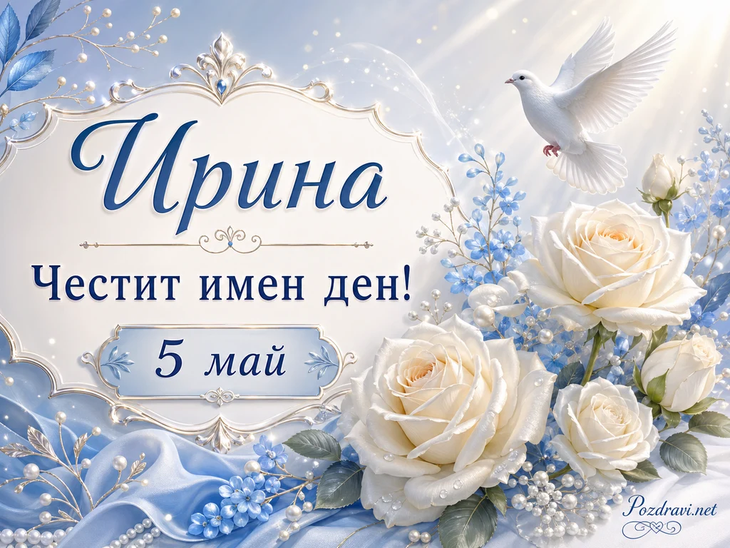 Ключови фрази: Ирина имен ден 5 май, бели рози за имен ден, гълъб и сини цветя, елегантна картичка за Ирина