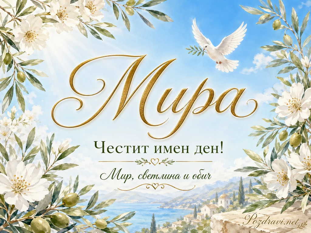 В центъра стои името 'Мира', изписано с големи златисти калиграфски букви. Под него е поставен празничният текст 'Честит имен ден!'. Най-долу в централната част е добавено посланието 'Мир, светлина и обич'. Фонът е светлосиньо небе с меки облаци, слънчеви лъчи и далечен морски пейзаж. В горната част лети бял гълъб, който подсилва усещането за чистота, мир и благословия. Рамката е украсена с маслинови клонки, зелени плодове и бели цветове, подредени като нежна акварелна декорация. В долната част се вижда средиземноморски бряг с къщи, църква и планини в далечината.