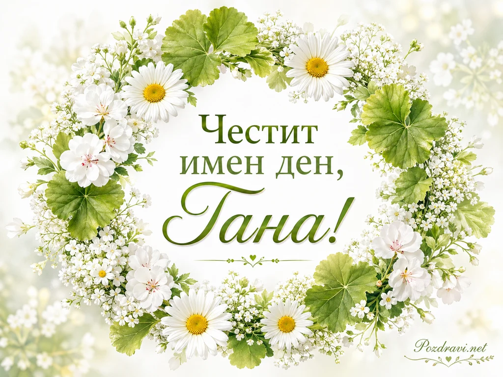 Нежна флорална композиция оформя венец от бели маргаритки, малки цветчета и свежи зелени листа. В центъра върху светъл фон е изписан надписът 'Честит имен ден, Тана!'. Името 'Тана!' е поставено с големи елегантни букви в тъмнозелен цвят. Белите цветя придават чисто, пролетно и празнично настроение. Зеленината около тях създава усещане за свежест, хармония и естествена красота. Картичката е подходяща за имен ден и носи меко, светло и сърдечно излъчване.