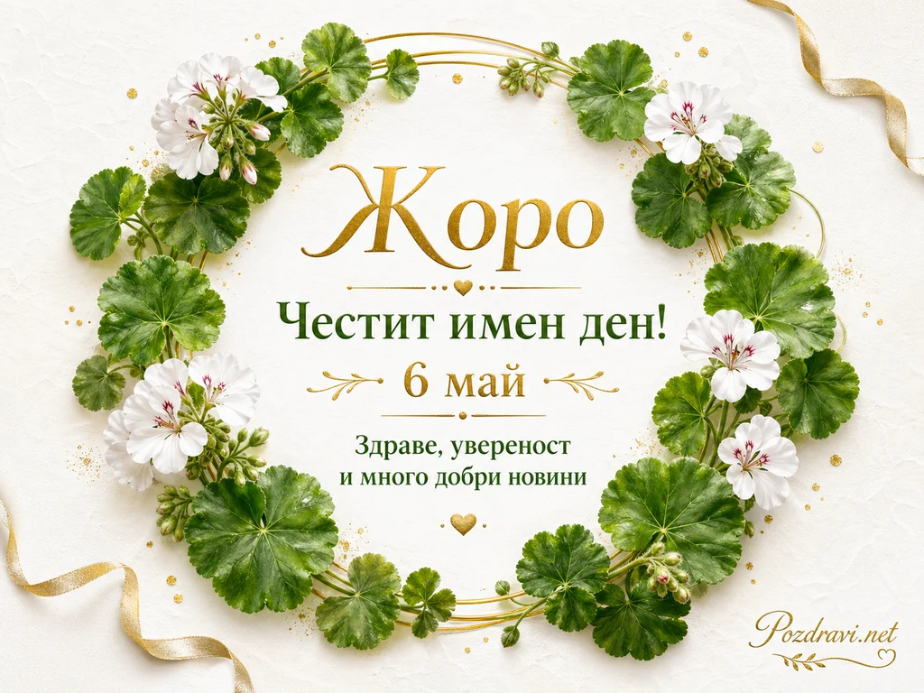 В центъра е изписано 'Жоро', а под него стои текстът 'Честит имен ден! 6 май Здраве, увереност и много добри новини'. Композицията е оформена като празнична именноденска картичка с бял фон и нежна хартиена текстура. Около надписа има венец от зелени листа, бели цветове и малки пъпки. Златисти извити линии, точици и декоративни елементи придават тържествен и елегантен вид. Белите цветя са разположени симетрично сред богатата зеленина и създават свежо пролетно настроение. В ъглите се виждат златисти панделки, които допълват празничната украса. Общото усещане е светло, изискано и лично насочено към човек с името Жоро.