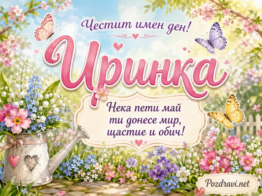 В центъра стои голям розов надпис с името 'Иринка', оформен с обемни букви и светли отблясъци. Над него е написано дословно: 'Честит имен ден!'. Под името върху декоративна табелка е изписано: 'Нека пети май ти донесе мир, щастие и обич!'. Около текста има пролетна градина с много розови, сини, бели, жълти и лилави цветя. Вляво се вижда бяла метална лейка, украсена със сърце, поставена сред цветята. В небето и сред клонките летят нежни пеперуди в розово, лилаво и жълто. Фонът е светъл и слънчев, с разцъфнали клони, мека зеленина и усещане за топъл майски ден.