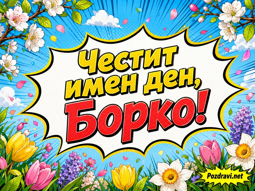 Ключови фрази: честит имен ден Борко комикс стил, пролетни цветя лалета и нарциси фон, син поп арт фон с радиални лъчи, балон взрив надпис честит имен ден