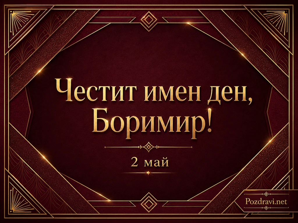 Тъмночервен фон с кадифена текстура е обрамчен от богата арт деко рамка със златни линии, геометрични мотиви и фини блясъци. В центъра с големи релефни златни букви е изписано 'Честит имен ден, Боримир!'. Под основния надпис стои датата '2 май' в по-малък златен шрифт. Ъглите са украсени с симетрични орнаменти и стилизирани лъчи, които придават тържествен и празничен вид. Златните контури оформят многоъгълна вътрешна рамка, която насочва погледа към текста. Общото усещане е луксозно и официално, с топло сияние и празнична атмосфера.