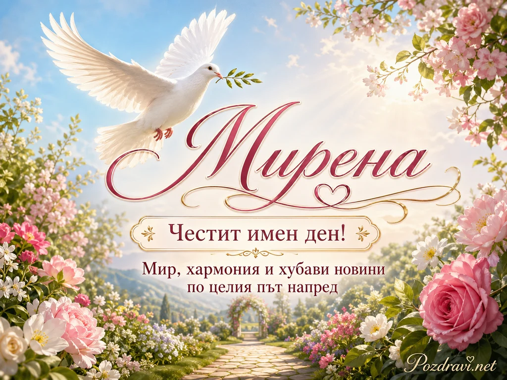 Бяла гълъбица с разперени крила лети сред меко синьо небе и носи зелена маслинова клонка в човката си. Около нея има богата пролетна градина с розови рози, бели маргаритки, цъфнали клонки и слънчеви лъчи. В центъра на картичката е изписано голямо декоративно име 'Мирена' с елегантни бордо и златисти орнаменти. Под името стои надписът 'Честит имен ден!'. По-долу е добавено пожеланието 'Мир, хармония и хубави новини по целия път напред'. В дъното се вижда светла пътека през цветна градина, която води към спокойна, зелена долина. Цялата композиция носи усещане за мир, надежда, нежност и празнична пролетна радост.
