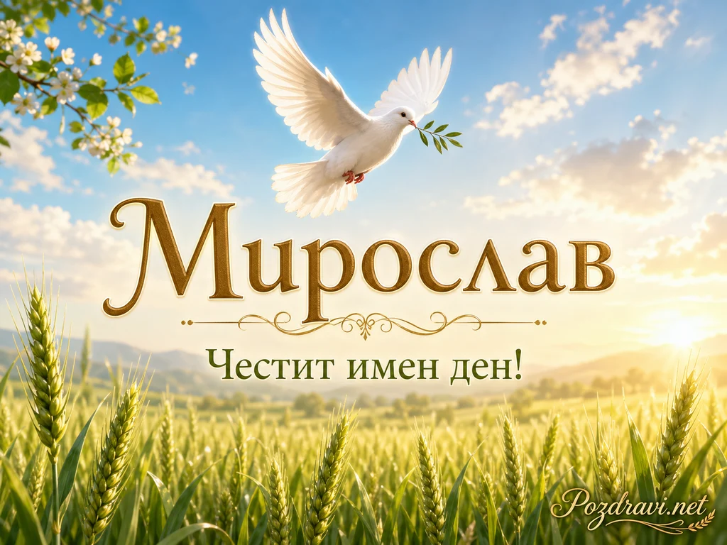 Ключови фрази: Мирослав имен ден, гълъб с маслинова клонка, златен надпис Мирослав, житно поле и слънчев изгрев