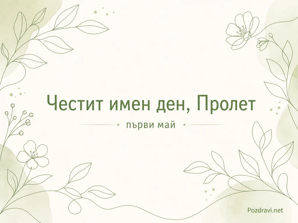 Ключови фрази: честит имен ден Пролет първи май, минималистичен зелен флорален дизайн 1 май, надпис Честит имен ден Пролет първи май, нежни ботанически листа и цветя в зелено