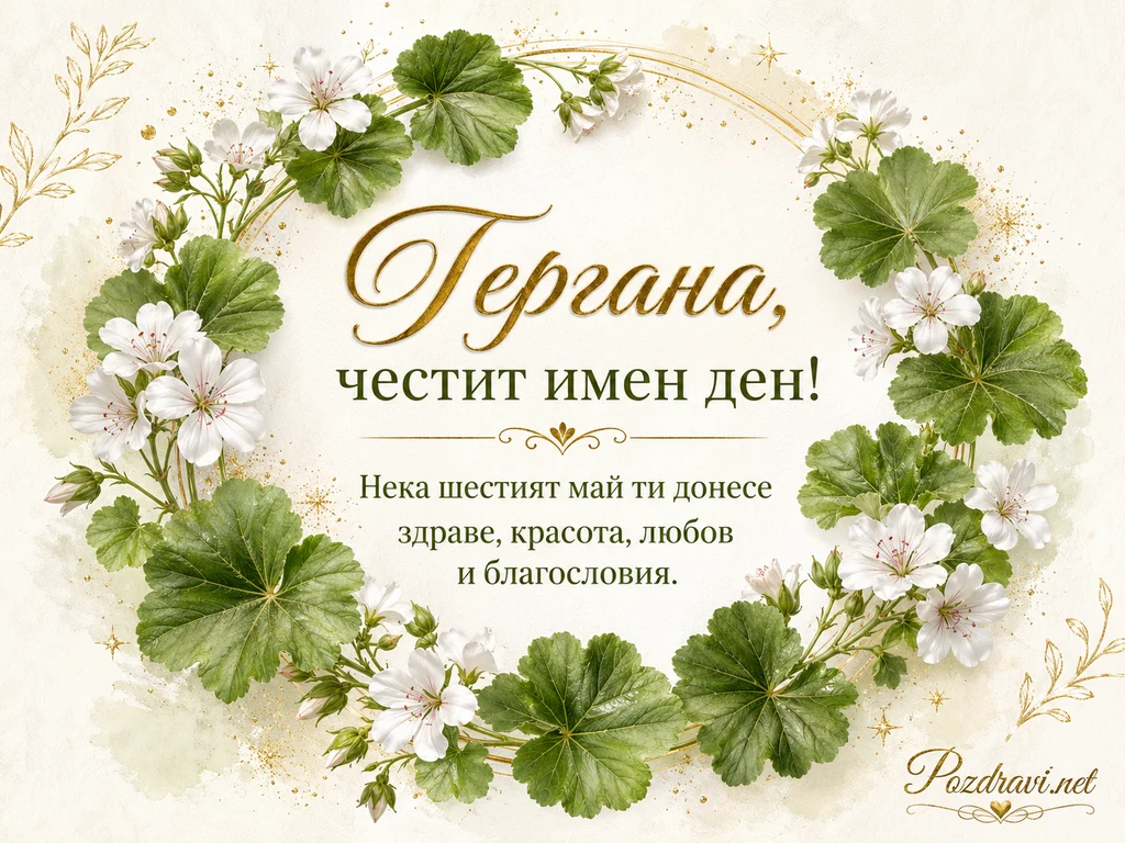 Картичката е посветена на Гергана и носи празнично послание за имен ден. В центъра е изписано дословно: 'Гергана, честит имен ден! Нека честият май ти донесе здраве, красота, любов и благословия.' Около текста има венец от свежи зелени листа и нежни бели цветове. Фонът е светъл, мек и напомня акварелна хартия. Златистите линии, звездички и пръски придават тържествен и елегантен вид. Композицията съчетава пролетна свежест, нежност и празнична благословия.