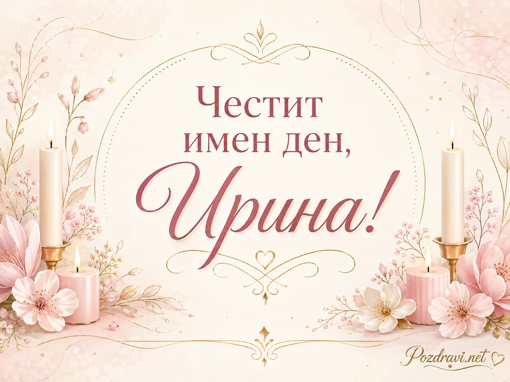 Нежна картичка в кремави и розови тонове създава празнично и изискано настроение. В центъра е изписан надписът 'Честит имен ден, Ирина!' с елегантна комбинация от печатен и калиграфски шрифт. Около текста има фина златиста овална рамка с декоративни орнаменти и сърца. От двете страни са поставени запалени свещи в красиви свещници и малки розови свещи. В долната част има бели и розови цветя, допълнени с деликатни клонки и златисти листа. Светлият акварелен фон с меки петна и златни точици прави композицията романтична и тържествена.