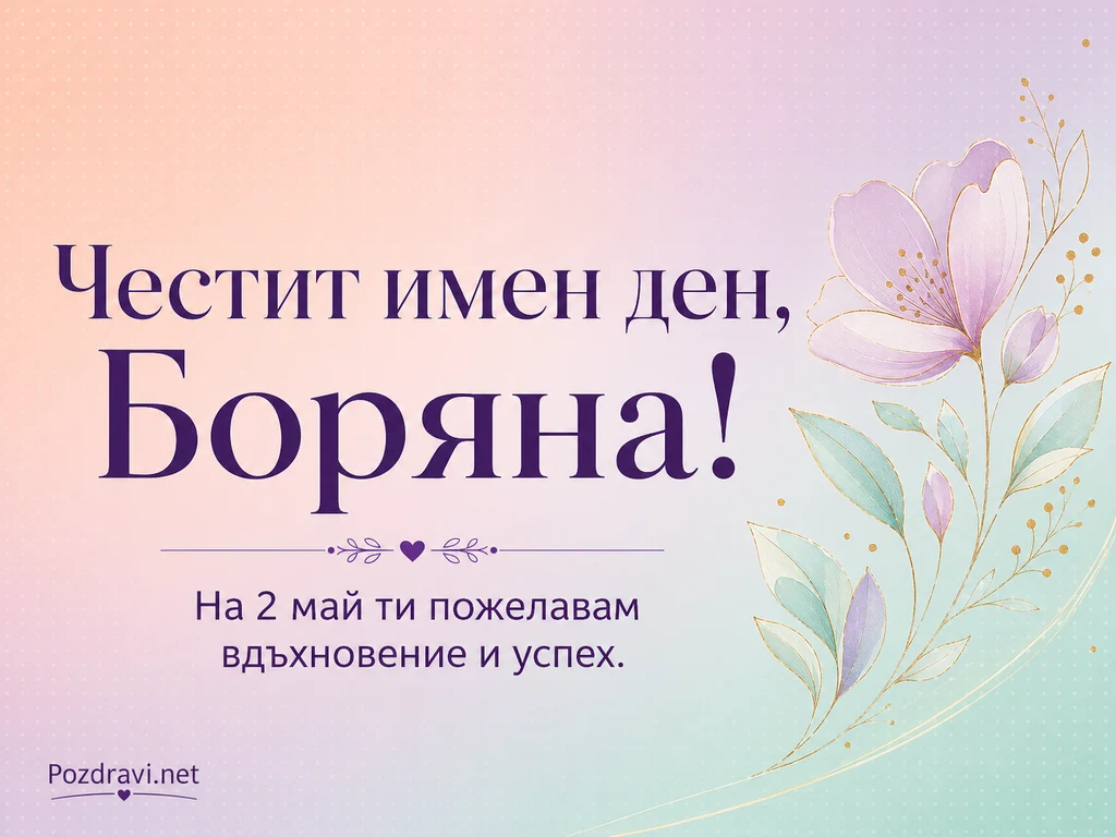 Пастелен фон прелива от прасковено и розово към лилаво и тюркоазено, като по него има фин точковиден орнамент. Вляво с големи тъмновиолетови букви е изписано: 'Честит имен ден, Боряна!'. Под основния текст има тънка декоративна линия с малки листенца и сърце в средата. По-надолу стои вторият надпис: 'На 2 май ти пожелавам вдъхновение и успех.'. Вдясно е нарисувано нежно акварелно цвете в лилави нюанси с тънки златисти контури и прашници. Около него има издължени листа в зелено-синкави тонове и дребни златисти точки, които придават леко празнично сияние.