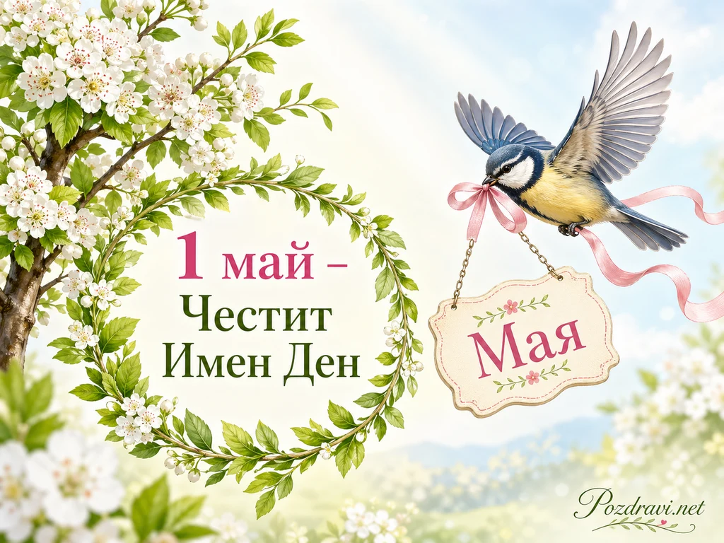 Ключови фрази: 1 май имен ден Мая, пролетен венец от листа и цвят, синигер с розова панделка, табелка с име Мая на верижка