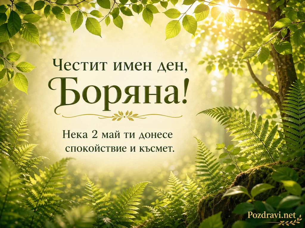 Фонът е светла пролетна гора с меки слънчеви лъчи и златисто сияние. В горната част се виждат свежи зелени листа по клоните, а светлината пробива между тях. Отдолу и по страните има гъсти папрати и мъх. В средата е изписан надписът: 'Честит имен ден, Боряна!'. Под него стои втори текст: 'Нека 2 май ти донесе спокойствие и късмет.'. Общото настроение е спокойно и топло, с усещане за утринна свежест и чист въздух сред природата.