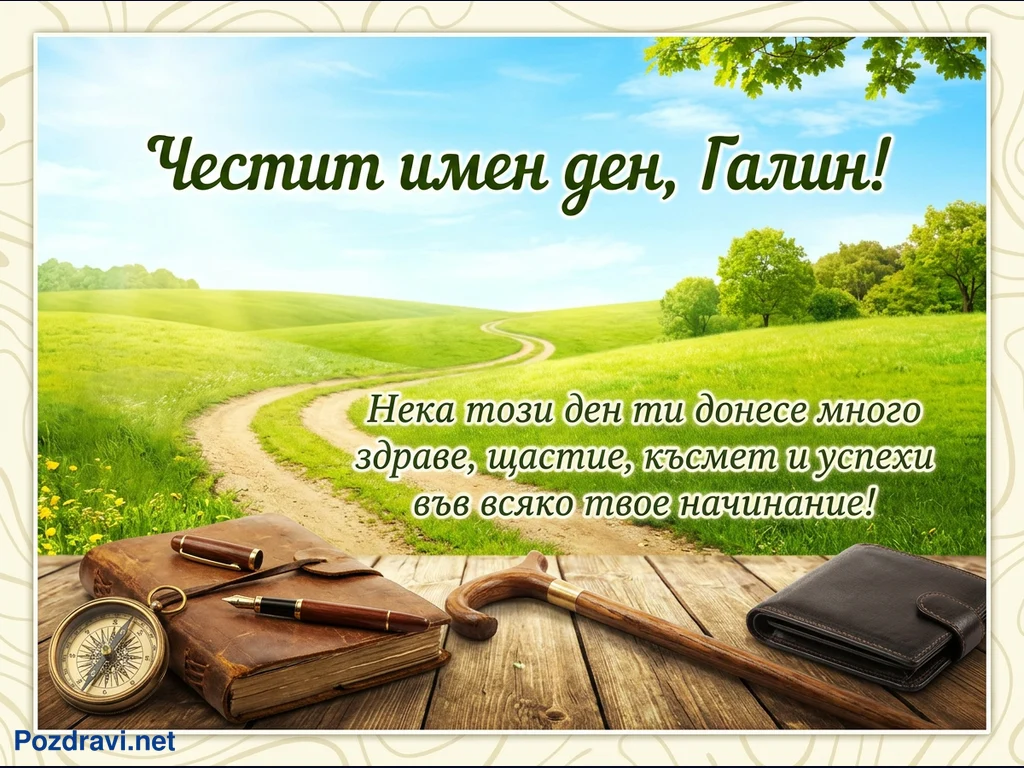 Показана е поздравителна картичка за имен ден, адресирана до Галин. Горната част на картичката изобразява живописен пейзаж с яркозелени хълмове, извиващ се черен път и синьо небе с бели облаци. В долната част, върху дървена повърхност, са подредени старинен кожен бележник, компас, писалка, дървен бастун и портфейл. Основният надпис 'Честит имен ден, Галин!' е в горната част, а под него има пожелание за здраве, щастие, късмет и успехи. Картичката създава усещане за пътешествие и мъдрост.