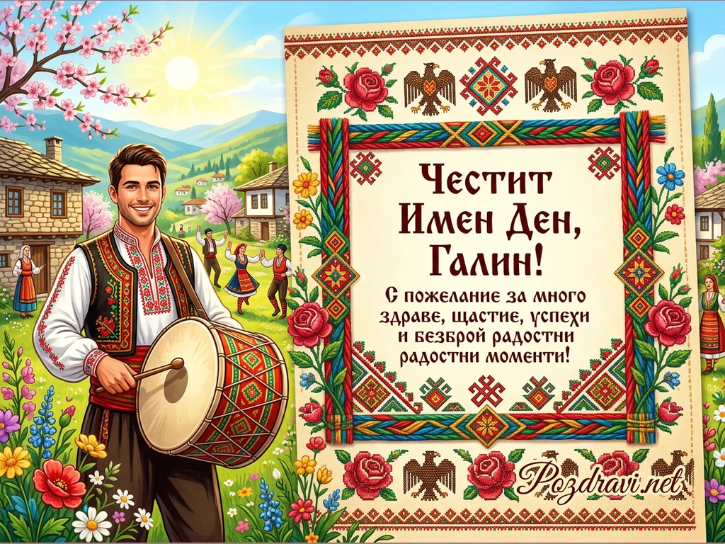 Тази цветна картичка за имен ден изобразява усмихнат мъж в традиционна българска носия, държащ тъпан, сред поле от диви цветя. На заден план се вижда живописно българско село с каменни къщи, цъфтящи дървета и танцуващи хора в народни носии под слънчево небе. Вдясно е разположена голяма поздравителна картичка, украсена с богати български шевици, рози и орли. На нея е изписано 'Честит Имен Ден, Галин!' с пожелания за здраве, щастие и успехи.