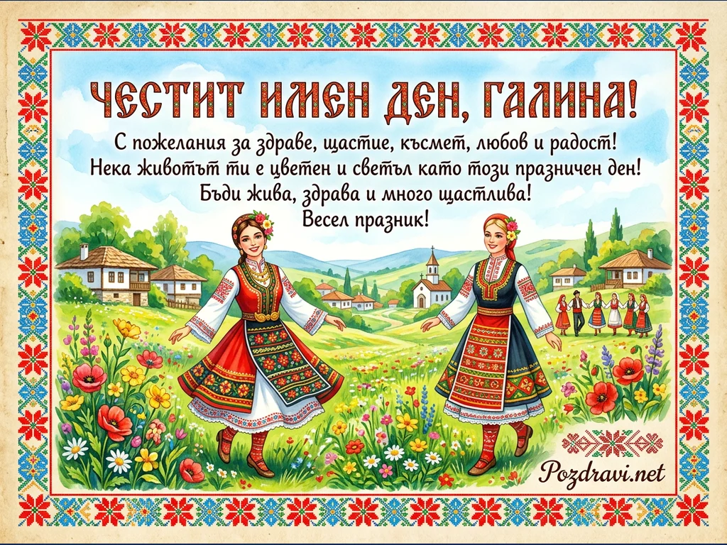 Тази цветна картичка честити имен ден на Галина. На нея са изобразени две усмихнати млади жени в красиви български народни носии, които танцуват сред поляна, осеяна с макове и други полски цветя. На заден план се вижда живописно българско село с традиционни къщи, църква и танцуващи хора, обградено от зелени хълмове. Картичката е с богато орнаментирана рамка с български шевици, придаващи й автентичен вид. Текстът отправя пожелания за здраве, щастие, късмет, любов и радост.