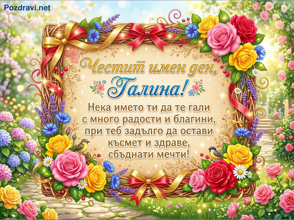Тази ярка поздравителна картичка е посветена на имен ден. В центъра ѝ е разположена плетена рамка, богато украсена с пищни рози в розово, жълто и червено, сини метличини, лавандула и малки птички. Вътре в рамката е изписано 'Честит имен ден, Галина!', придружено от сърдечно пожелание за много радости, благословии, късмет, здраве и сбъднати мечти. Фонът представлява слънчева градина с разцъфнали цветя и пътека, създаваща празнична и жизнерадостна атмосфера, подчертана от искрящи светлинни ефекти.