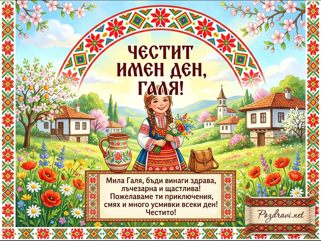 Тази цветна картичка за имен ден изобразява усмихнато момиче в традиционна българска носия, държащо букет от полски цветя. Тя е на фона на живописен пролетен пейзаж с характерни български къщи, църква и цъфтящи дървета и макове. Над момичето се извива арка с български шевици, съдържаща надписа 'ЧЕСТИТ ИМЕН ДЕН, ГАЛЯ!'. В долната част има рамка с пожелание за здраве, щастие и много усмивки. Цялостната композиция е изпълнена с празнично настроение и фолклорни мотиви.