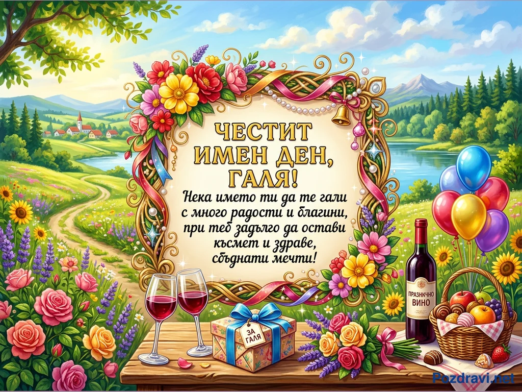 Ключови фрази: Честит имен ден Галя, Поздравителна картичка, Празничен подарък, Вино и цветя, Красив пейзаж
