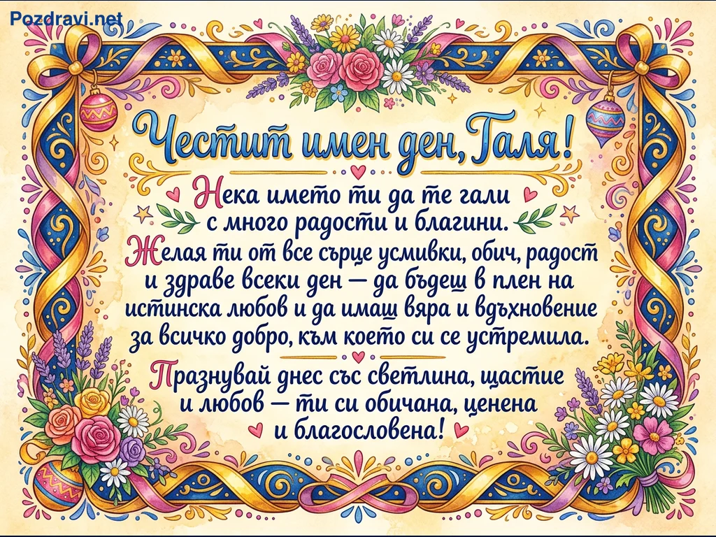 Ключови фрази: Честит имен ден Галя, Поздравителна картичка имен ден, Цветна картичка Галя, Имен ден пожелания, Празнична картичка
