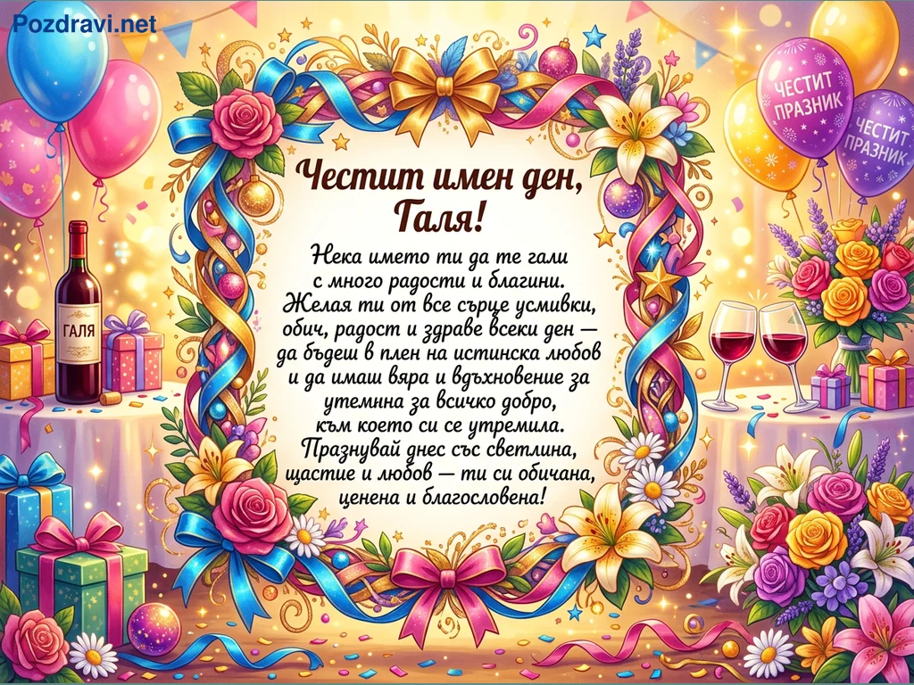 Ключови фрази: Имен ден Галя, Честитка имен ден, Празнична картичка, Пожелание Галя, Цветя балони вино