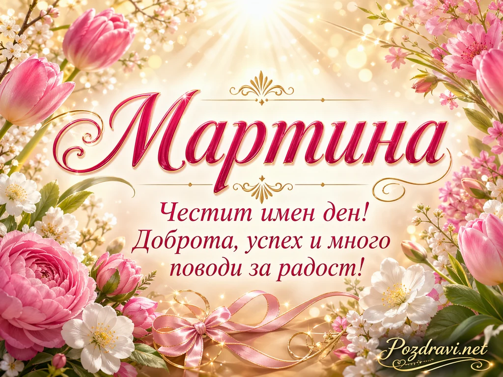 Картичката е посветена на имен ден и е оформена с празнична пролетна атмосфера. В центъра е изписано името 'Мартина' с големи розово-червени декоративни букви. Под него стои надписът 'Честит имен ден! Доброта, успех и много поводи за радост!'. Около текста има розови лалета, нежни бели цветчета, розови цветове и зелени листа. Фонът е светъл, златист и сияен, с меки отблясъци и слънчеви лъчи отгоре. В долната част има розова панделка с празничен блясък, която подсилва усещането за елегантност и радост. Цялостното настроение е топло, нежно и тържествено, подходящо за поздрав към жена с името Мартина.