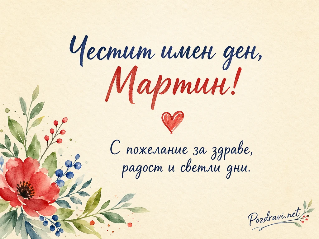 Картичката е в нежен акварелен стил върху топъл светъл фон с фина хартиена текстура. В лявата долна част има голямо червено цвете с тъмна сърцевина, обградено от зелени листа и малки сини и червени плодчета. Основният надпис гласи дословно: 'Честит имен ден, Мартин!'. Под него е нарисувано малко червено сърце, което добавя личен и сърдечен акцент. По-долу е изписано дословно: 'С пожелание за здраве, радост и светли дни.'. Композицията е спокойна, празнична и подходяща за имен ден на човек на име Мартин.