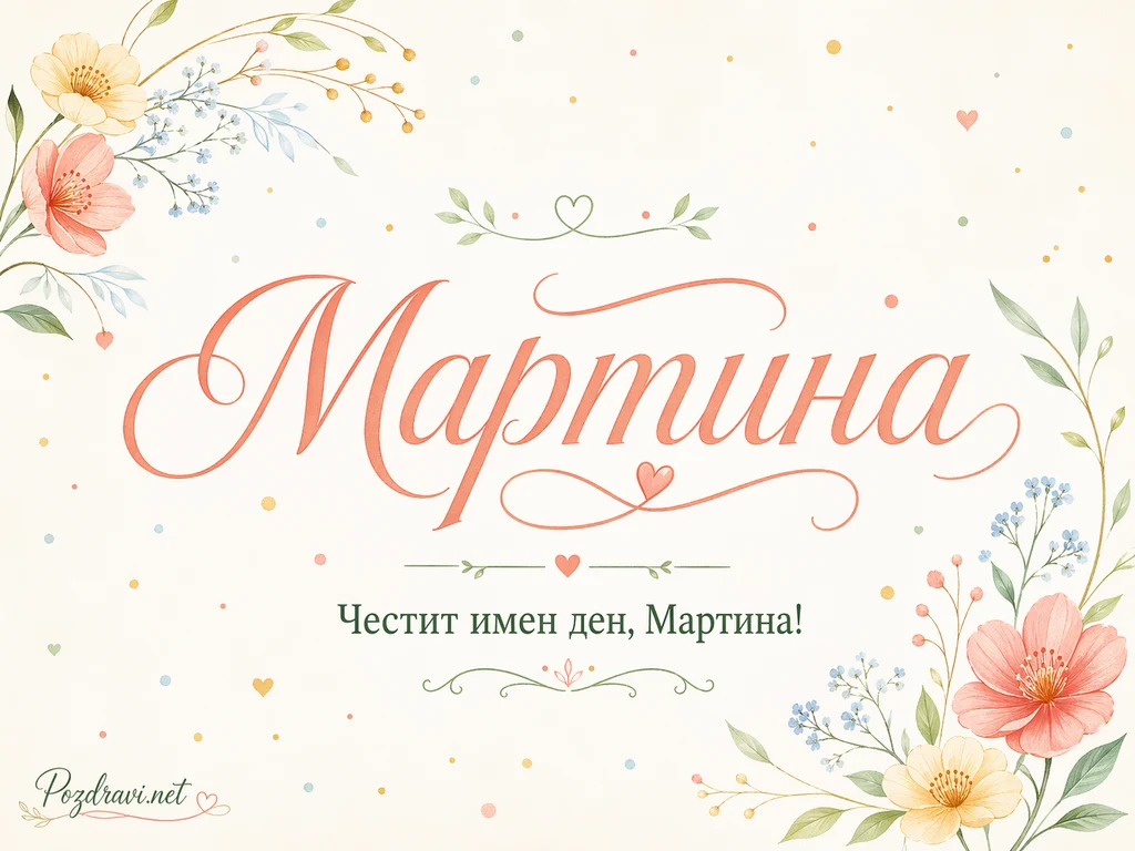 Нежна картичка с бял фон е украсена с акварелни цветя, зелени листа и малки цветни точици. В центъра с голям елегантен коралов шрифт е изписано 'Мартина'. Под името стои надписът 'Честит имен ден, Мартина!'. Около текста има фини декоративни линии, малки сърца и растителни орнаменти в зелено и коралово. В горния ляв ъгъл се виждат светли жълти и коралови цветя с нежни клонки и сини дребни цветчета. В долния десен ъгъл има по-богата флорална композиция с голямо коралово цвете, жълто цвете, зелени листа и дребни сини и розови пъпки. Общото усещане е празнично, романтично и много подходящо за имен ден на жена с името Мартина.