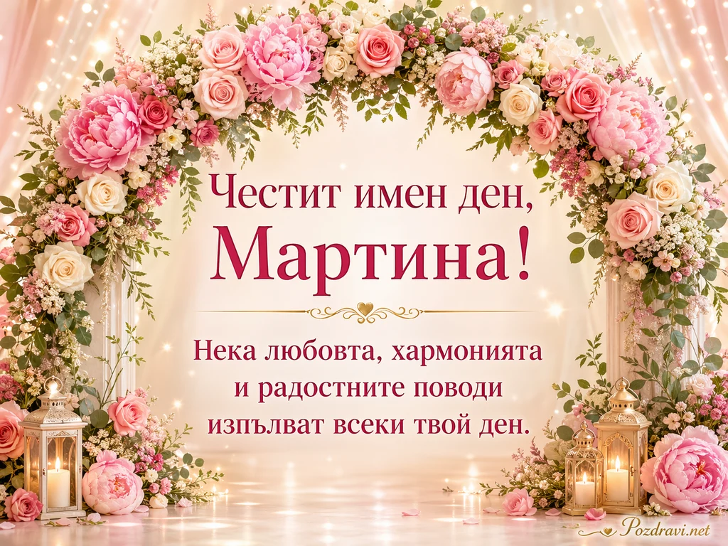 Нежна празнична картичка е оформена с богата арка от розови божури, рози, дребни цветя и зелени листа. Фонът е светъл и топъл, с ефектни блещукащи светлини и меки завеси в прасковени тонове. В долната част има декоративни златисти фенери със запалени свещи, които добавят уют и тържественост. Централният надпис гласи: 'Честит имен ден, Мартина! Нека любовта, хармонията и радостните поводи изпълват всеки твой ден.' Текстът е изписан с елегантен тъмнорозов шрифт и стои хармонично сред флоралната украса. Композицията създава романтично, светло и празнично настроение, подходящо за имен ден на жена с името Мартина.